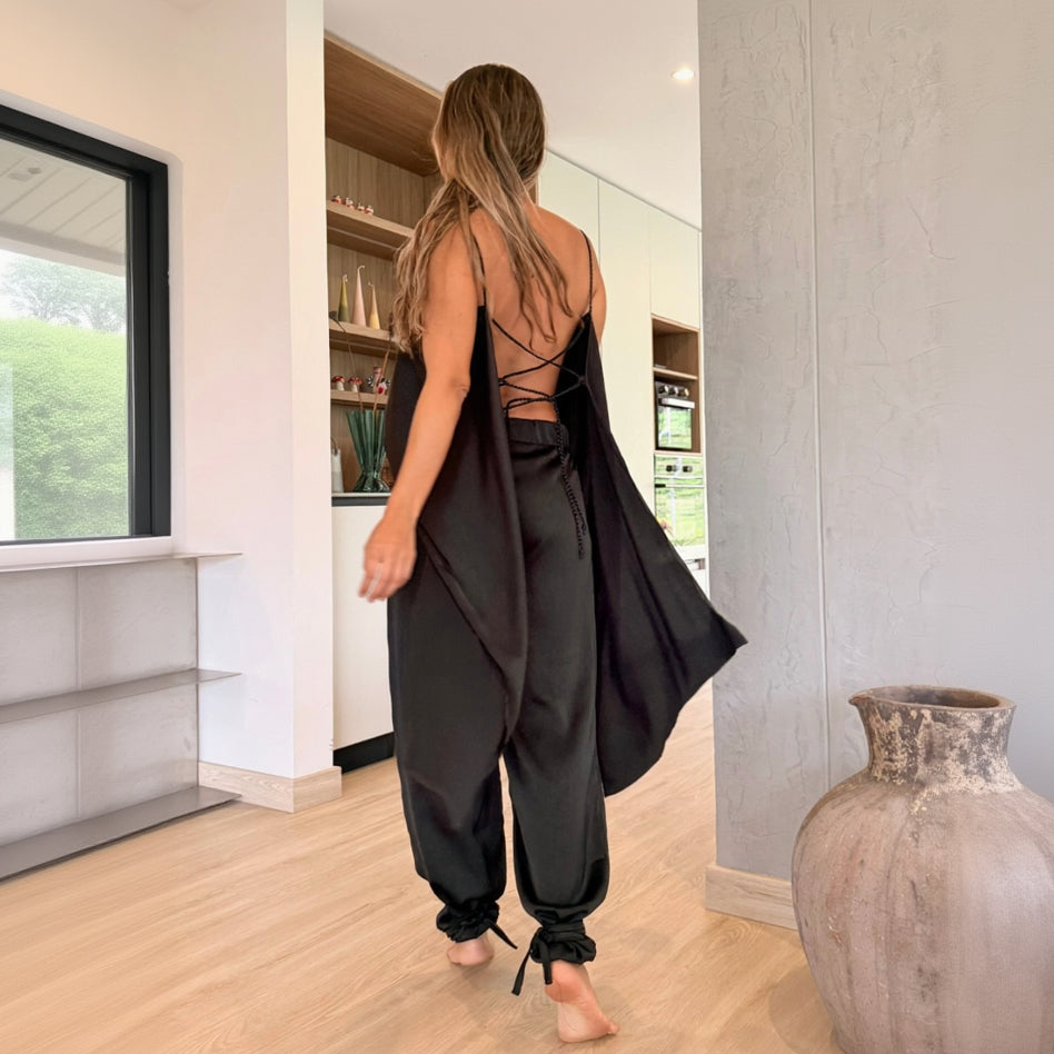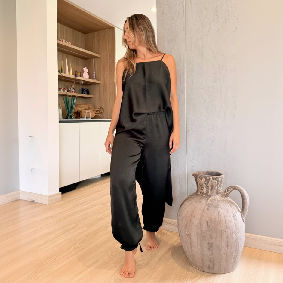 Top confeccionado en seda de acabado suave y brillo sutil, diseñado para caer libremente sobre el cuerpo. Su espalda abierta se construye a partir de delicadas tiras trenzadas que se entrelazan y ajustan con ligereza, convirtiéndose en el centro visual de la pieza. Liviano, etéreo y profundamente femenino, es un top que celebra la sensualidad serena y el equilibrio entre estructura y fluidez.