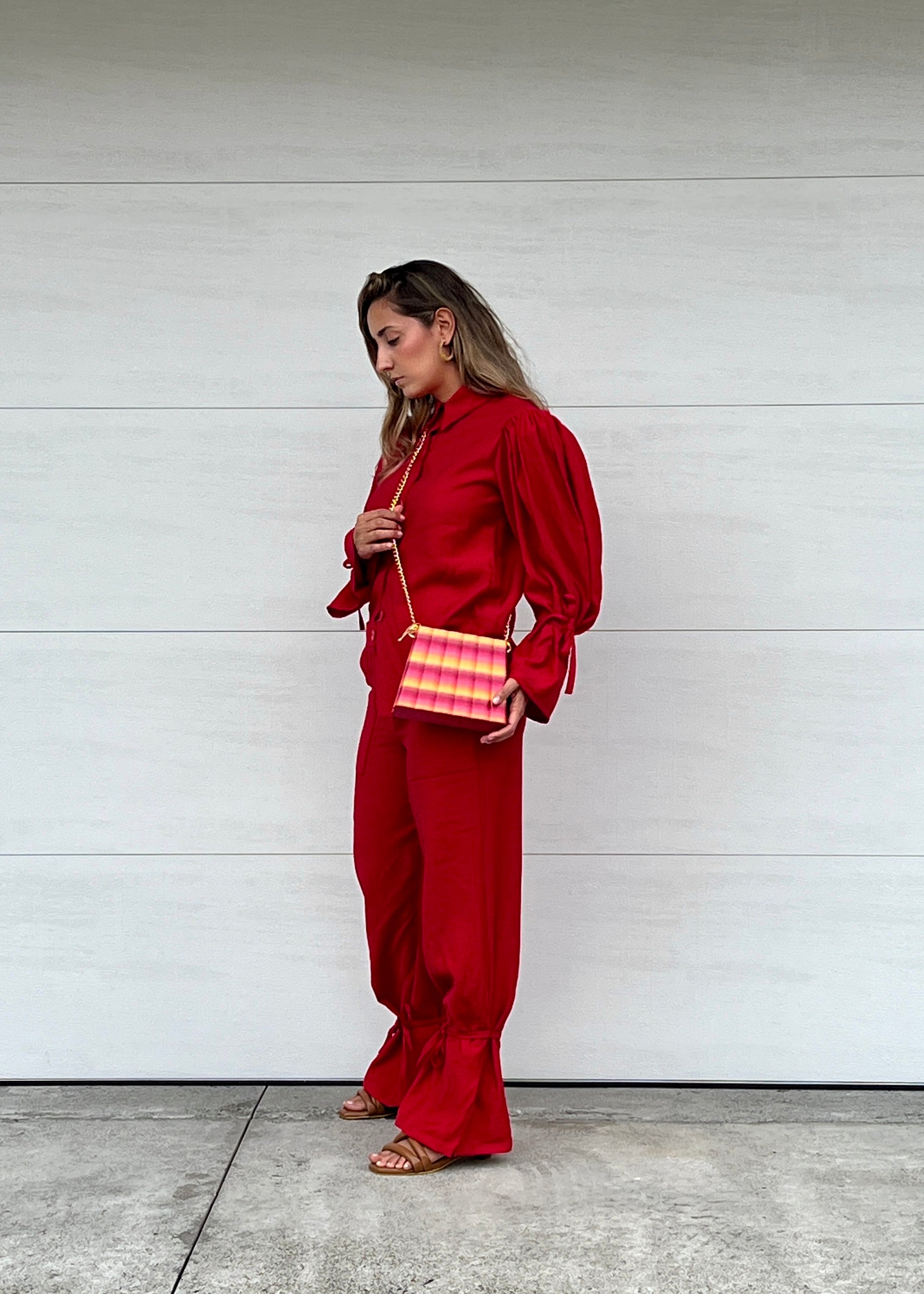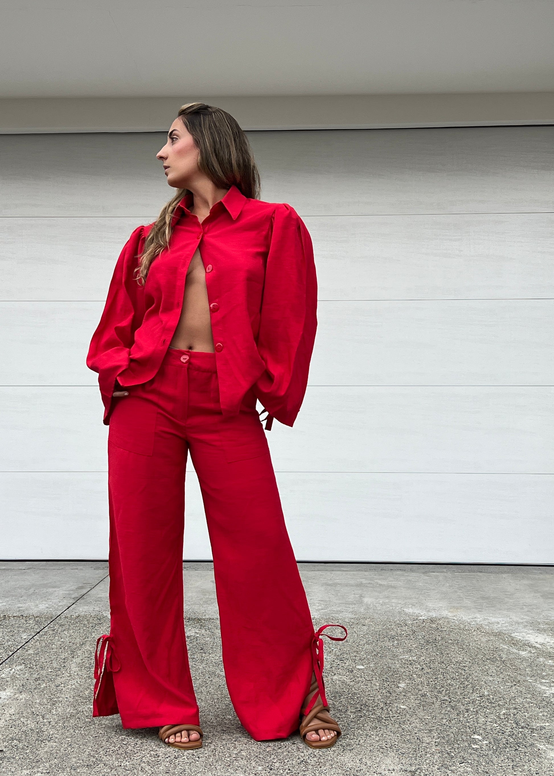 Camisa recta con manga englobada en la parte superior. Contiene tiras de amarrar para ajusta la manga en la mitad del antebrazco y generar una silueta diferente en la manga.