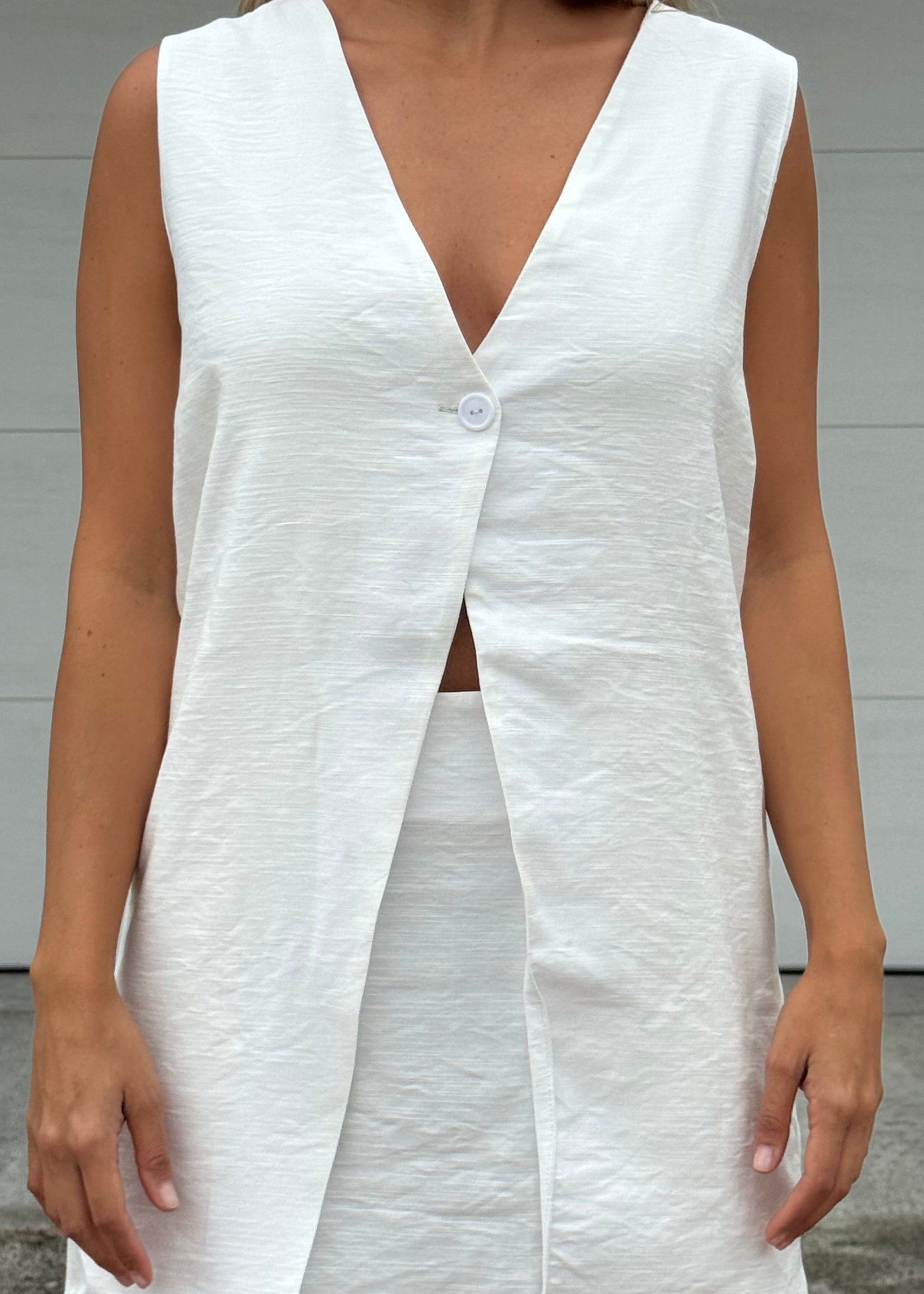 Chaleco recto con largo hasta antes de la rodilla y se sobre monta con un solo botón.