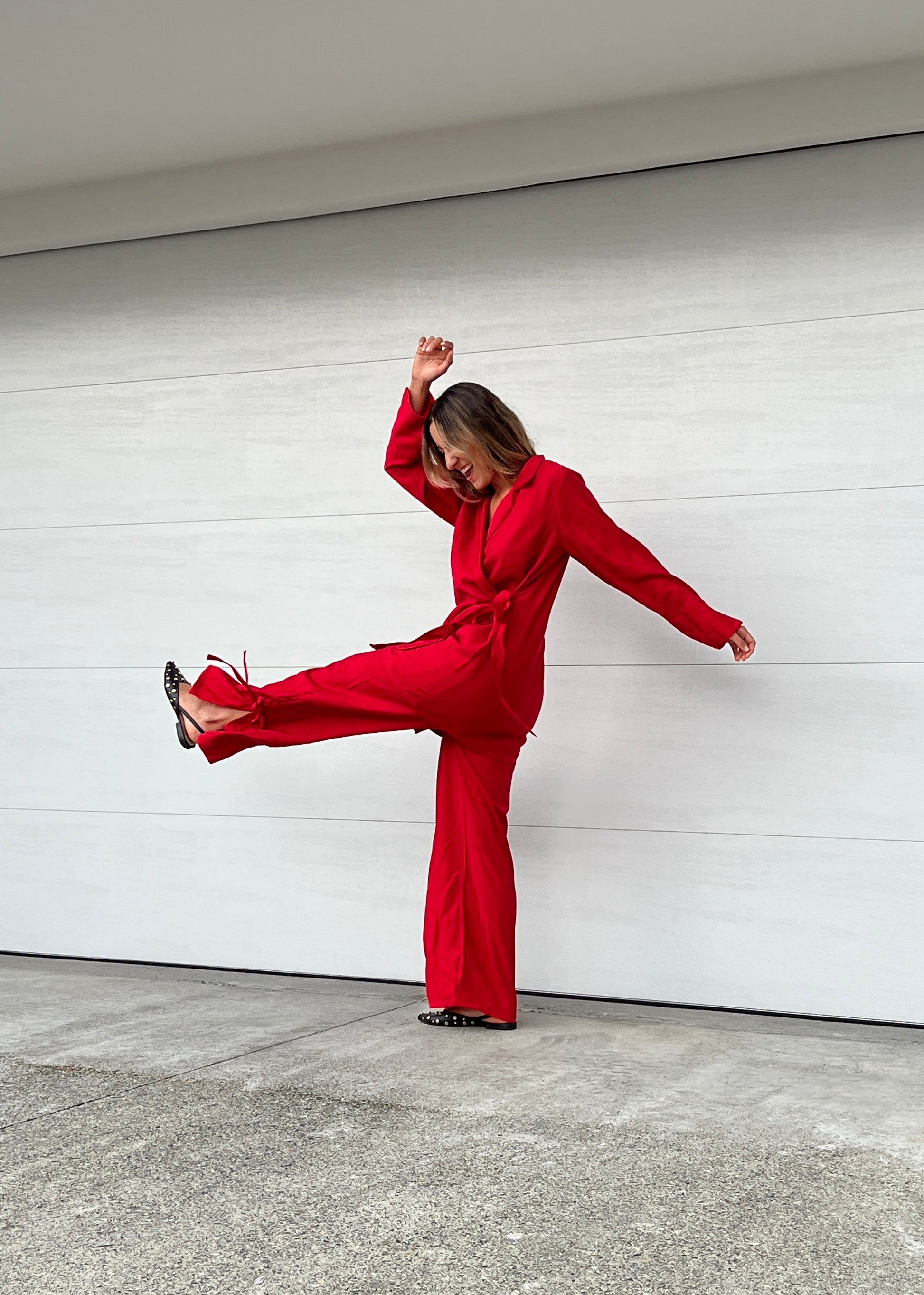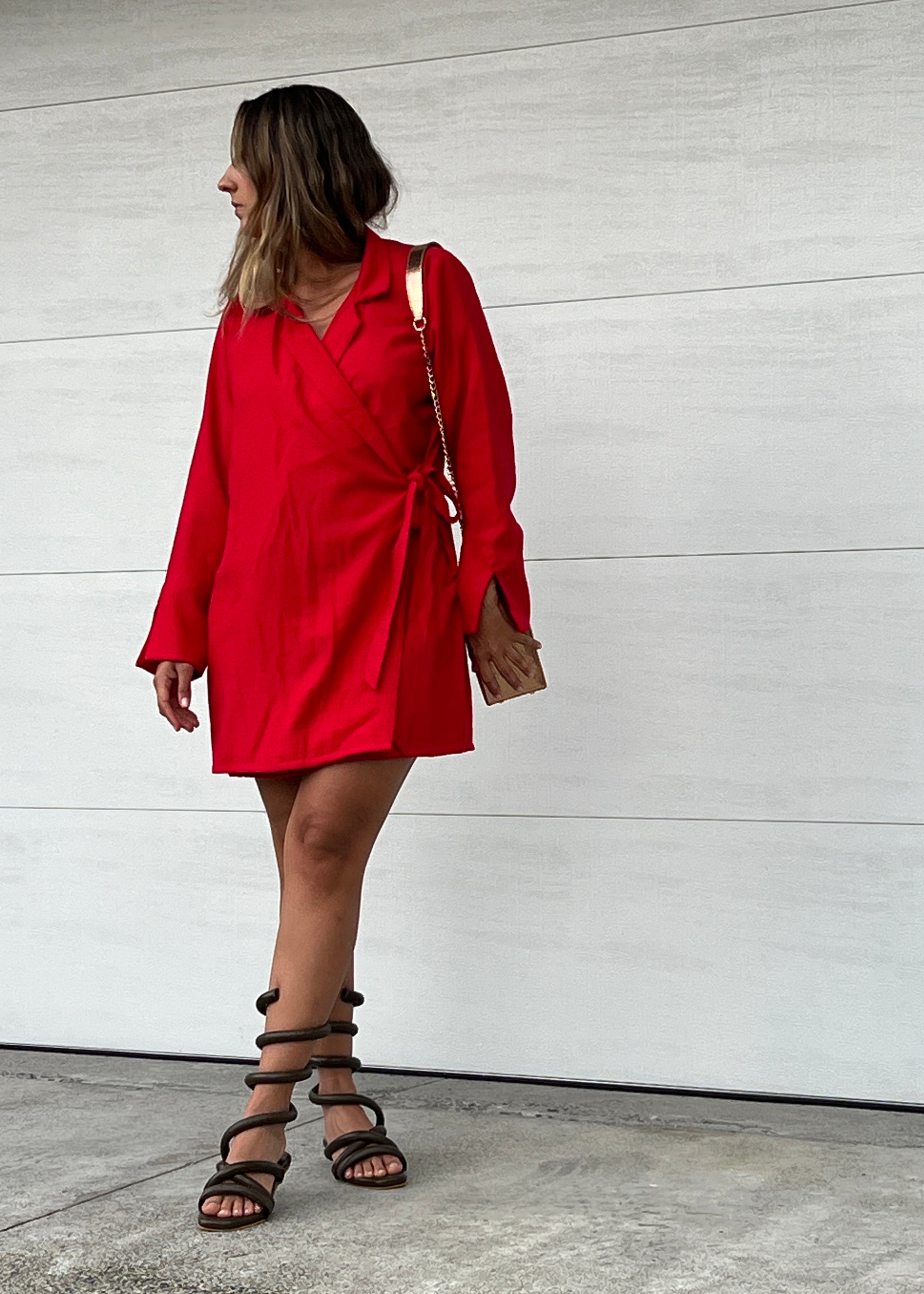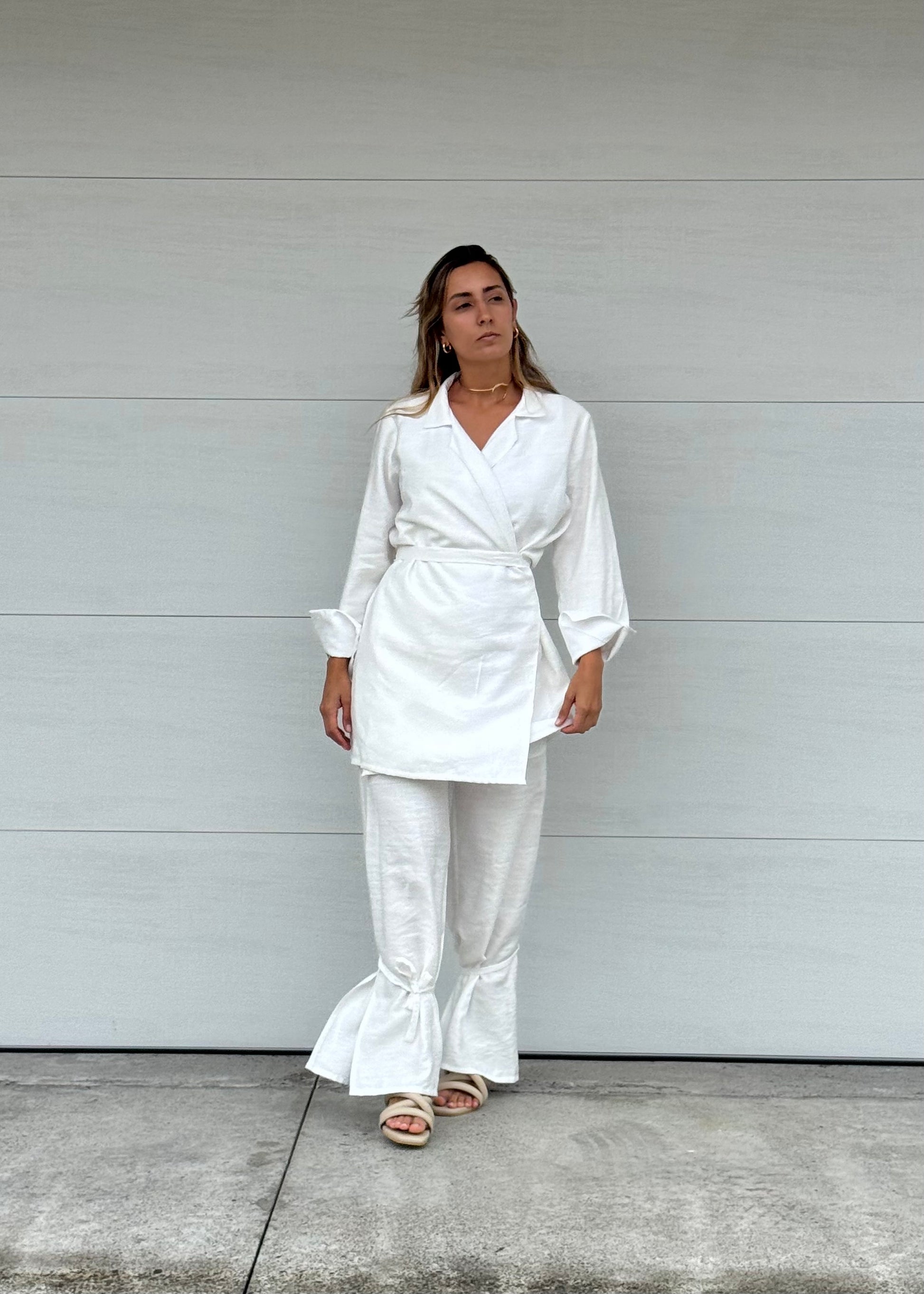 Kimono con sobre cruce de derecha a izquierda ajustable con nudo. Manga larga recta con abertura a la mitad del antebrazo. Cuello cruzado en V con solapa tipo blazer.