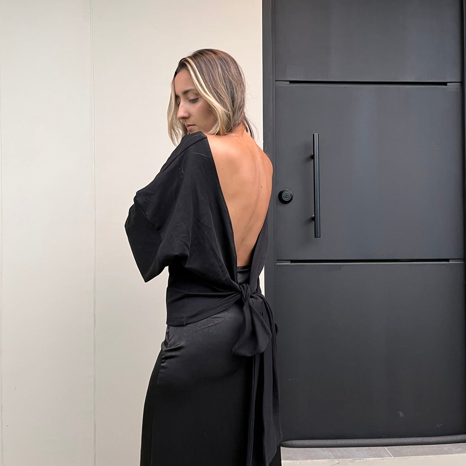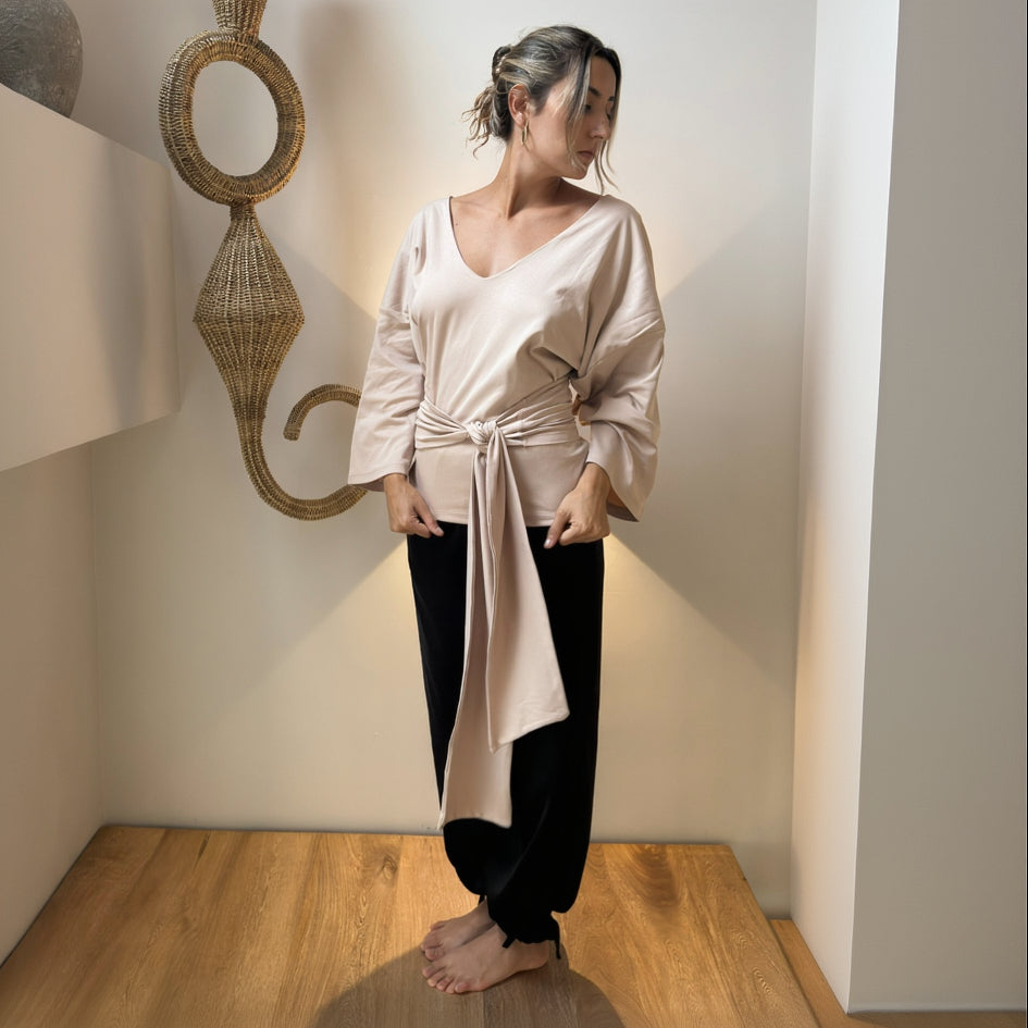 Blusa de construcción envolvente con tiras que define la forma según la silueta. Elaborada en algodón 100% de tacto suave, ofrece una sensación fresca y cómoda durante todo el día. Sus mangas amplias y el cruce delicado crean un balance entre relajación y sofisticación, convirtiéndola en una pieza funcional, consciente y fácil de integrar a un guardarropa atemporal.