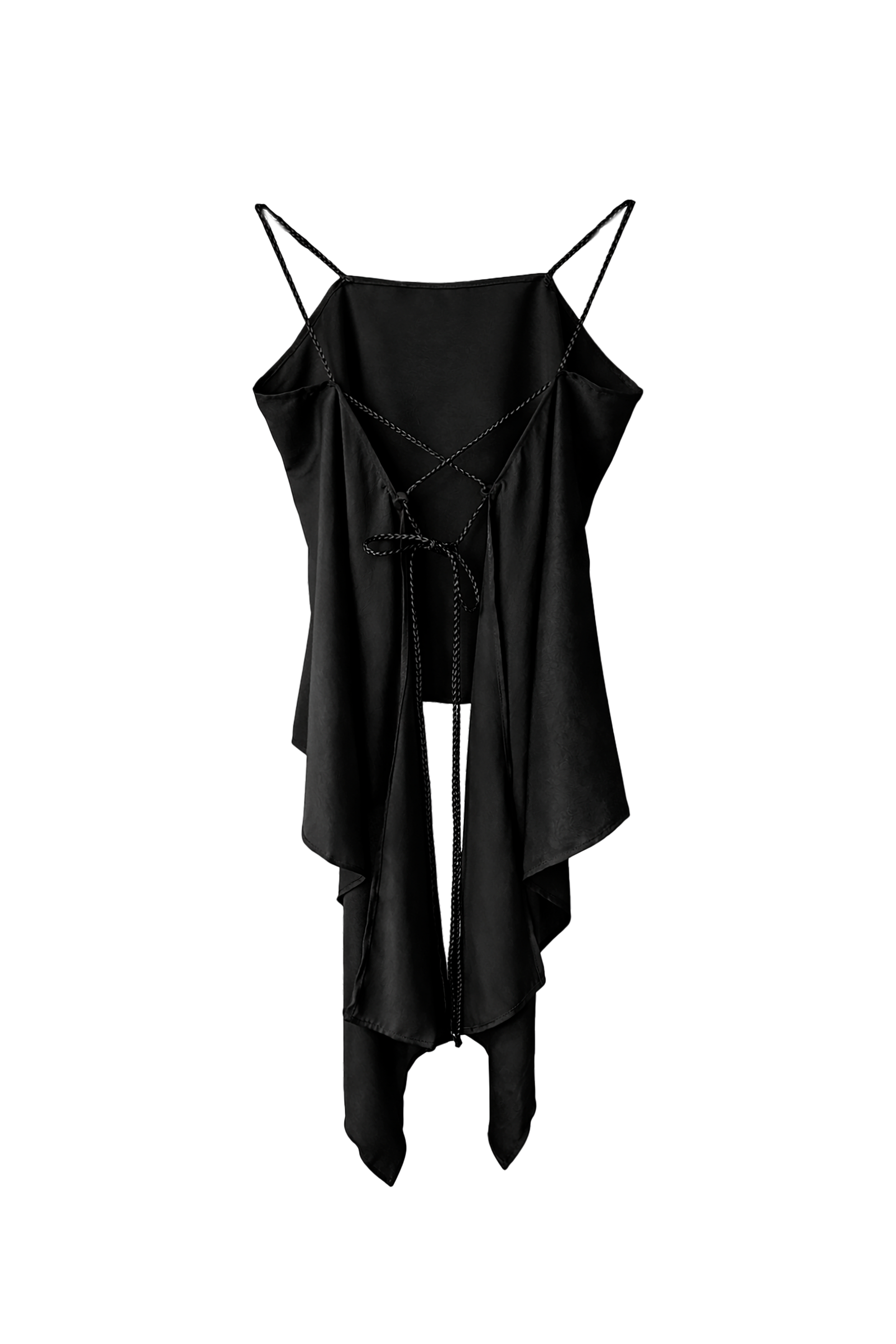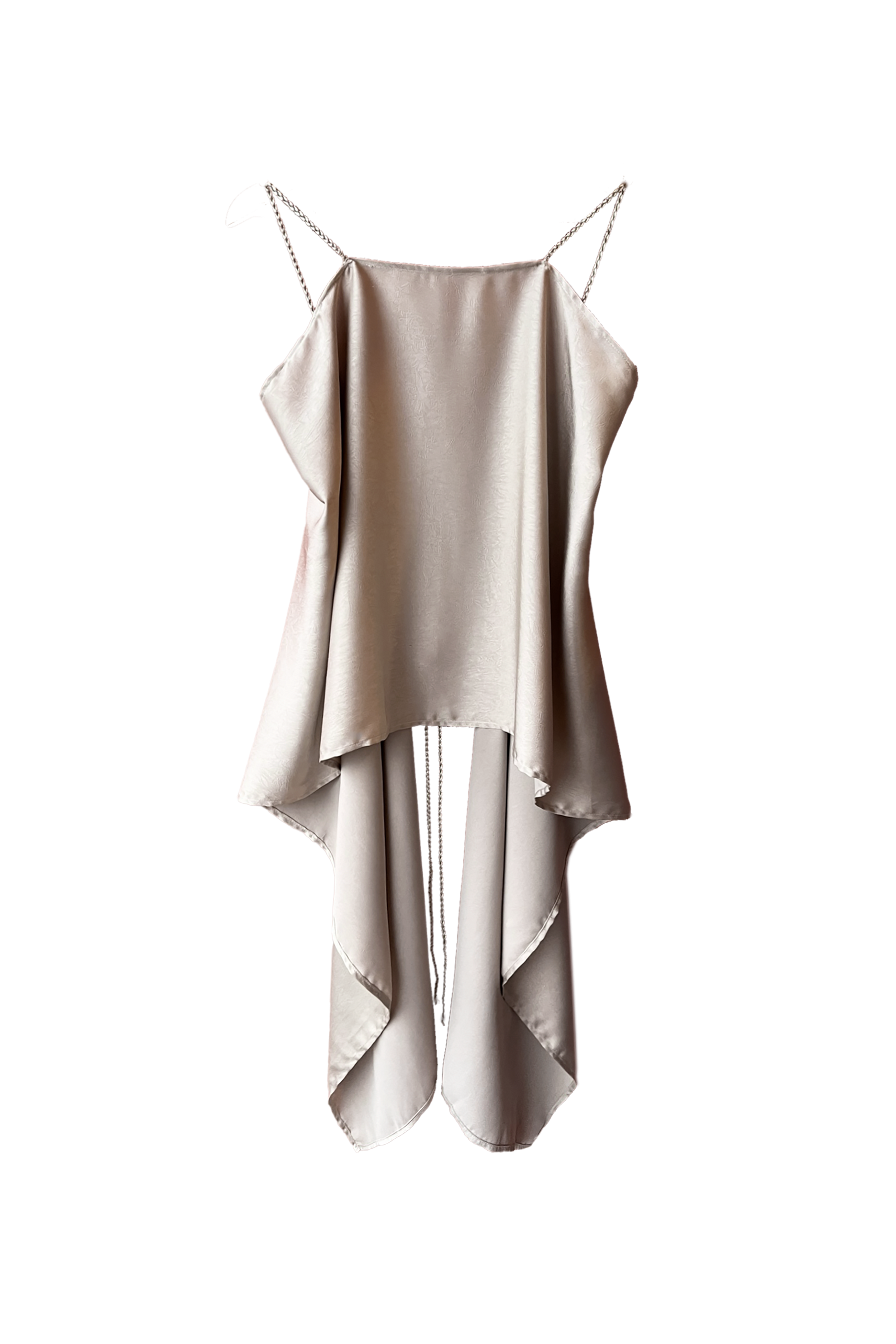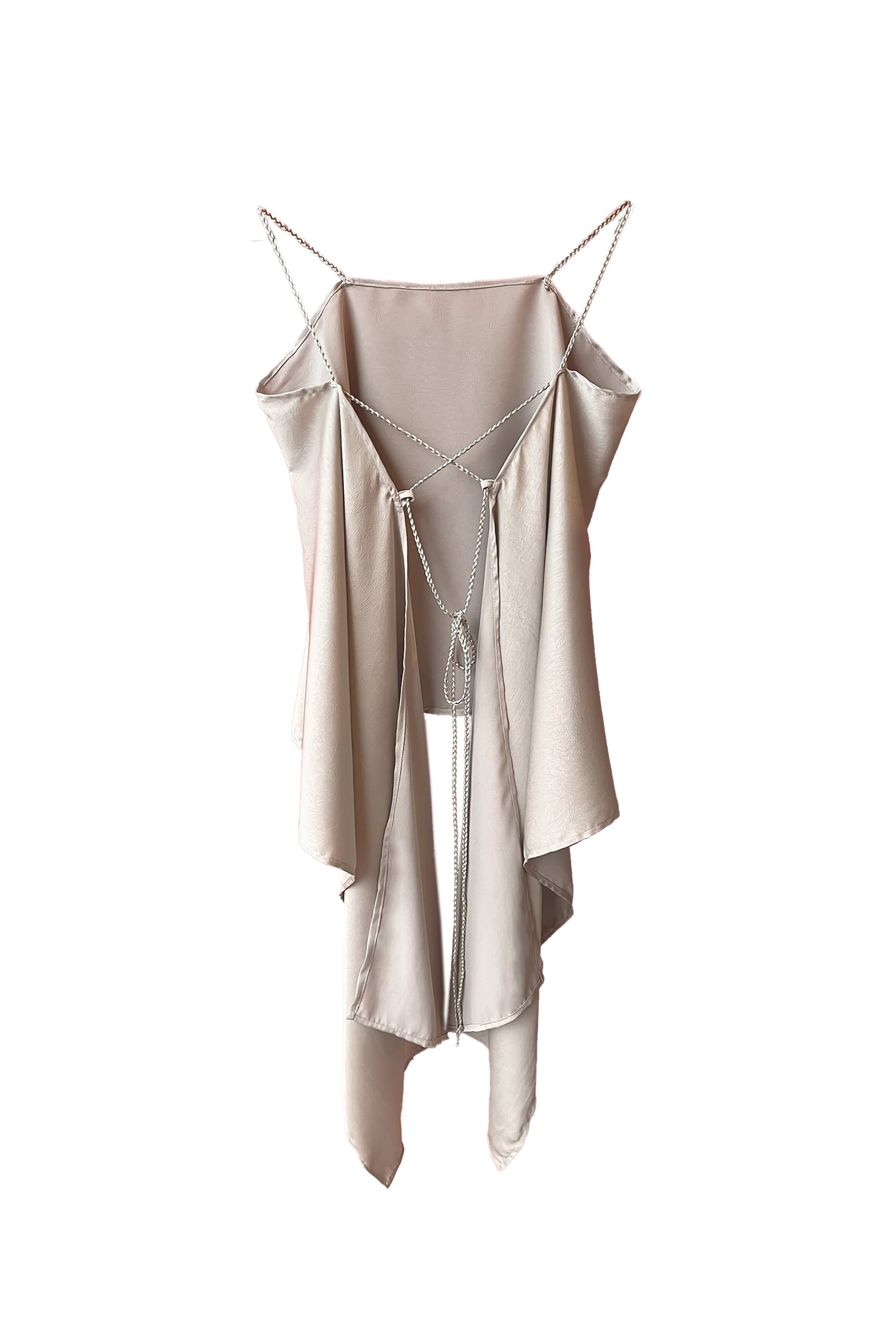 Top confeccionado en seda de acabado suave y brillo sutil, diseñado para caer libremente sobre el cuerpo. Su espalda abierta se construye a partir de delicadas tiras trenzadas que se entrelazan y ajustan con ligereza, convirtiéndose en el centro visual de la pieza. Liviano, etéreo y profundamente femenino, es un top que celebra la sensualidad serena y el equilibrio entre estructura y fluidez.